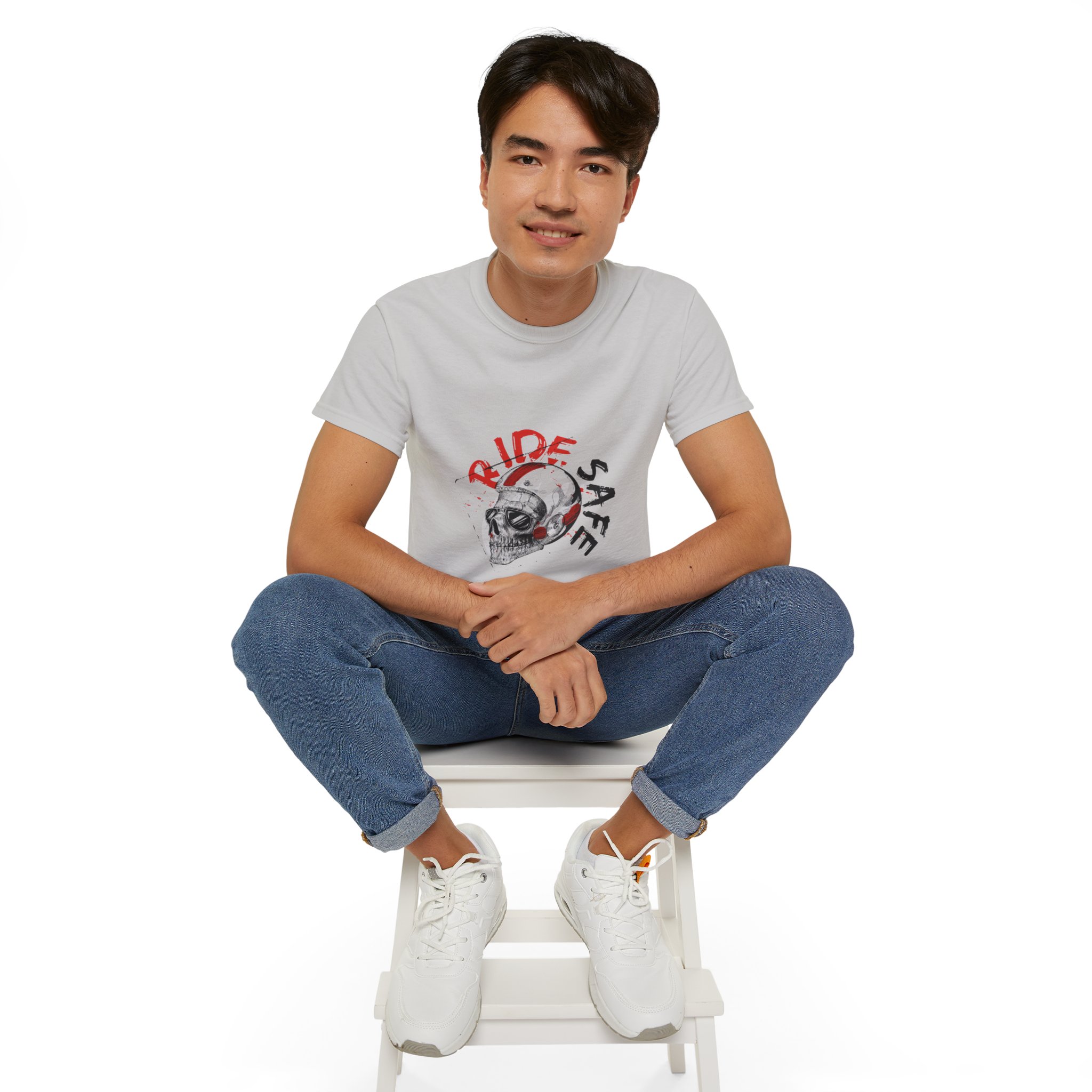 Introducing our Unisex Ultra Cotton Tee, perfectly designed for comfort and style. This tee embraces a relaxed fit, making it ideal for everyday wear. Its unique design features a striking skull graphic, infused with a bold ‘RIDE SAFE’ message, radiating an edgy and adventurous vibe. Whether you’re heading out for a casual gathering, a day of errands, or just lounging at home, this versatile t-shirt seamlessly fits into your life.